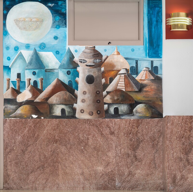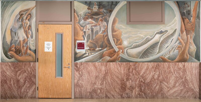 Cleinmann’s mural displays multiple generations of Black women, a manifestation of Biggers’ teachings about their importance. The mural is one of the few unfinished murals in Hannah Hall. Typically, unfinished murals were painted over. The mural was recently restored by conservators.