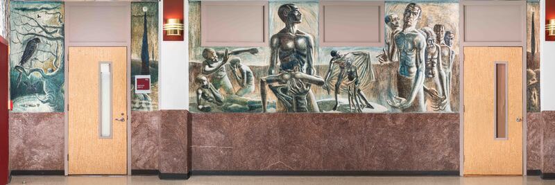 Portraying the brutality of war in the mid-twentieth century, McCowan, a veteran, integrates the wall’s architectural elements (a fire hose and extinguisher) to highlight the tension of the scene. The mushroom cloud above the fire hose highlights Cold War-era anxieties.