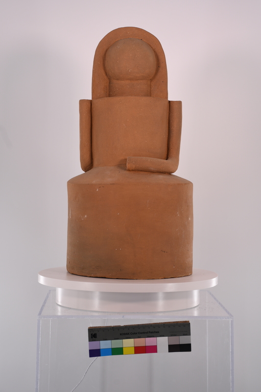 “Shrine,” by Curtis Watson Jr., features a duck-like creature surrounded by various embellishments, including spirals, a commonly used visual motif in the student terracottas. Unfortunately, the head of the figure is missing, leaving only the body in view. The full sculpture can be seen in archival photos shot by Dr. John T. Biggers of the artist at work.