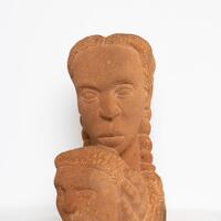 Marion Perkins was a sculptor from Marche, AK. Mother and Child is a limestone bust of its namesake. The mother is placed behind the child as she holds his head. The mother looks toward the viewer as the child looks away.