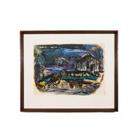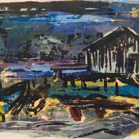 Samella Sanders Lewis was a printmaker, painter, sculptor, and art historian from New Orleans, LA. Trapper's Rest depicts a fishing pier at night. Two boats, fishing equipment, and a pier lodge, which fishermen often use for rest and storage, are positioned alongside the pier.