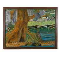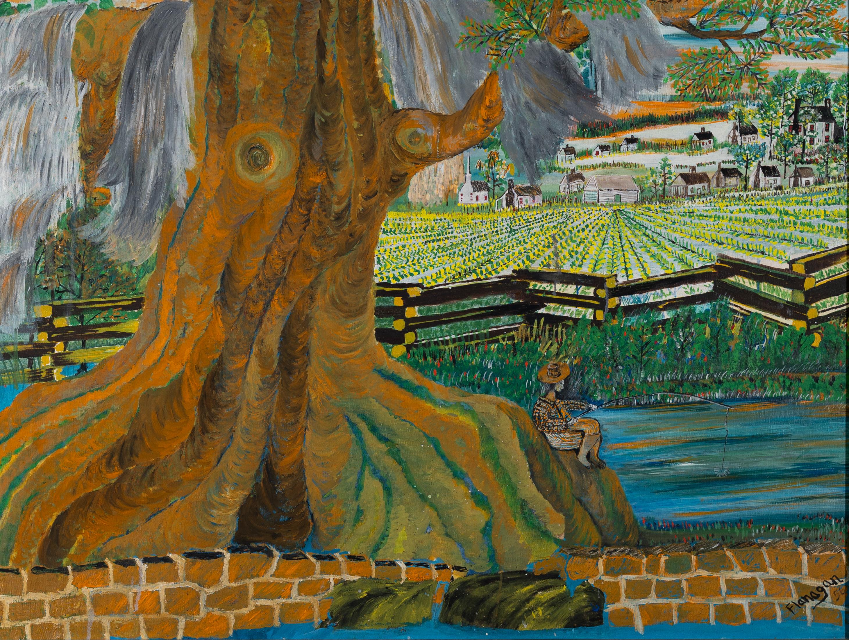 Thomas Jefferson Flanagan was an artist and activist from Florence, GA. Fishing on the Quarters is a landscape painting with a large tree and a person fishing from a body of water. The tree and fisherman are in the foreground, while a wooden gate borders an acreage of colorful crops painted linearly.
