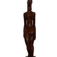 John W. Rhoden was a renowned sculptor from Birmingham, AL. Female Figure is a wooden sculpture of a nude woman. The woman's demeanor is peaceful, and she stands slack-armed with a relieved expression.