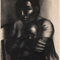 John Woodrow Wilson was a famous painter known for his creative portraits and stylistic approach to social justice. Mother and Child is a black-and-white depiction of a mother embracing their child. The mother has a solemn expression as she looks away from the viewer; her child is tucked into her arms, facing the viewer.