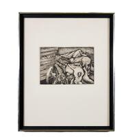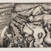 John Arterberry was an artist who worked in the art department at Langston University from Tallahassee, Florida. Of the Soil is a print depicting two farmers working the land. The two workers, dressed in overalls and straw hats, are bent over, picking crops to place in their wagons.