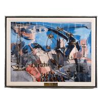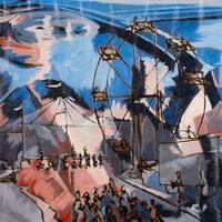 Maurice Strider was an artist and art educator from Lexington, KY. The Carnival shows a carnival landscape with crowds of abstracted human figures walking around and riding a Ferris wheel. The hue composition of blue, pink, and gray is similar to Cubism.