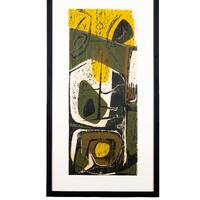 Harper T. Phillips was an artist from Courtland, AL. The Ant is a painting with numerous geometric forms and lines in a vertical composition. Each white, yellow, green, and black shape lay in pocketed areas overlapping black borders and lines.