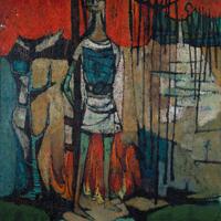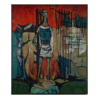 John Arterberry was an artist who worked in the art department at Langston University from Tallahassee, FL. Martyr shows a woman wearing a top with a cross and standing barefoot in a natural setting. The woman looks straight ahead, slightly smiling as a small fire sits behind her.