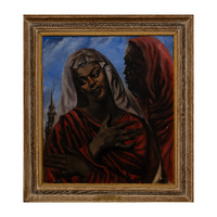 Romeyn van Vleck Lippman was a 19th-century painter and educator. Church is a portrait of a man and woman with a cathedral in the distance. The woman embraces herself and glances away from the man as he leans toward her. They both wear red cloaks, and the woman wears a white headdress.
