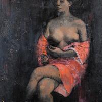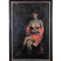 Harold Lloyd Neal was an artist from Detroit, MI. The Red Robe is a portrait of a woman with a red robe hanging off her shoulders. The subject's breasts are visible as she poses, legs crossed, looking away from the viewer.