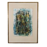 William S. Carter was an abstract, landscape, still-life, and figurative painter from St. Louis, Missouri. Three Women (figures) depicts three nude women drawn over muted watercolors. The women maintain a confident pose that separates them from their abstract background.