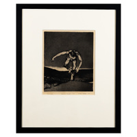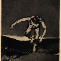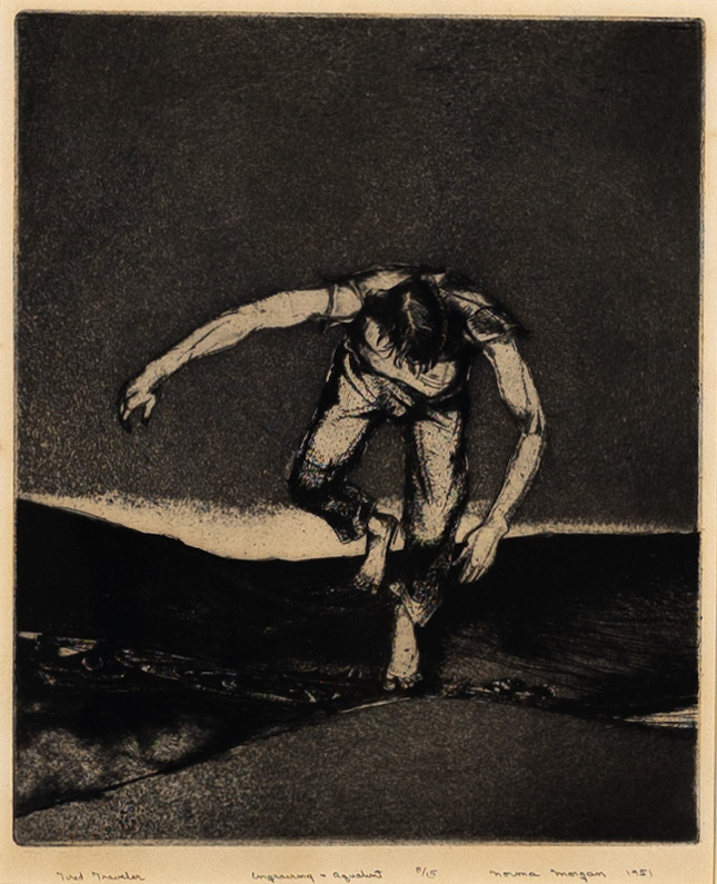 Norma Morgan was a painter from New Haven, Connecticut. Tired Traveler depicts a human figure tilting forward with their arms swinging outward. The figure is in the center of a dark landscape of an ocean shore.