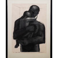 John Woodrow Wilson was a famous painter known for his creative portraits and stylistic approach to social justice. Father and Child is a black-and-white print of a seemingly nude father holding his equally nude son. The piece embodies the intimacy between parent and child.