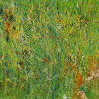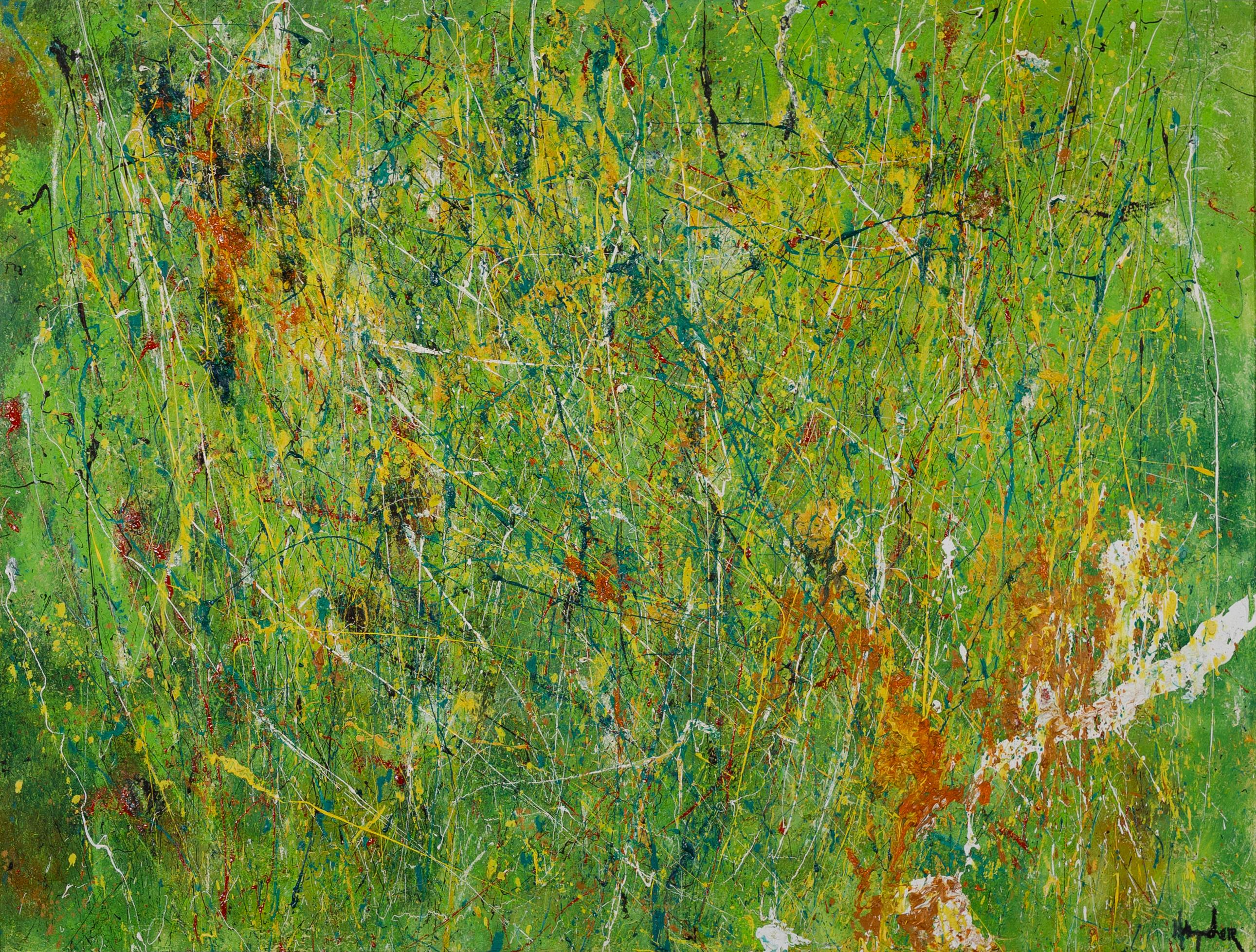 Gilbert H. Hatcher was a painter from Augusta, GA. Spring Folic is an abstract painting with a green background. The color palette includes hues of yellow, red, orange, green, white, and black. Gestural strokes of paint are layered to create a feeling of nature and springtime.