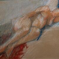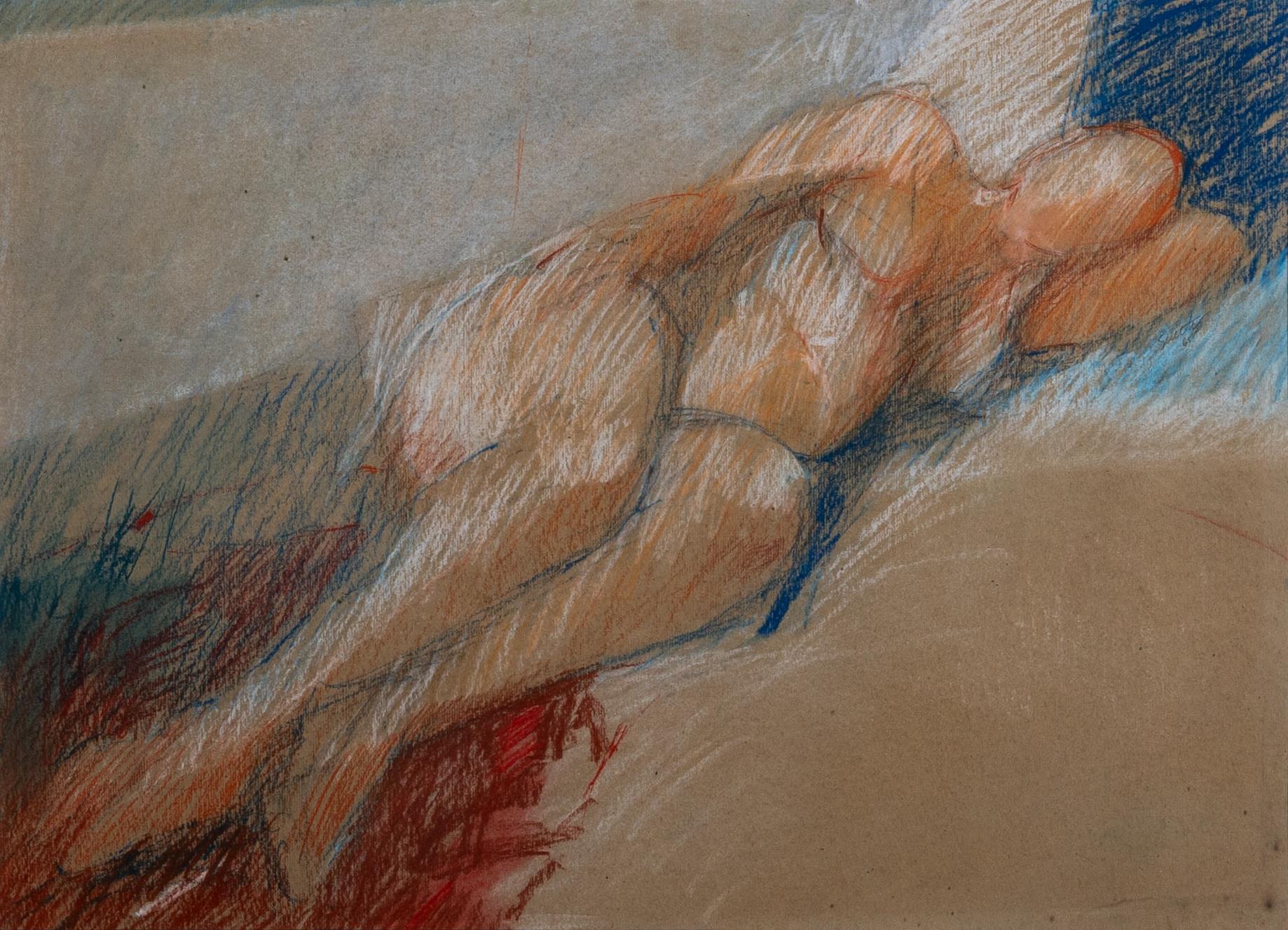 Alvin Smith was an artist from Brooklyn, NY. Reclining Nude depicts a nude figure laid back in a fetal-like position.