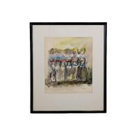 Eva Booker was an artist from Atlanta, GA. The Girls is an abstract depiction of a group of girls with blonde hair, red bikini tops, and low-waisted skirts.