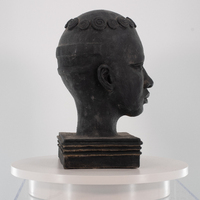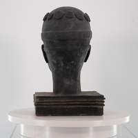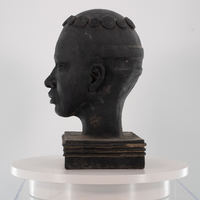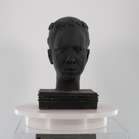 This unknown student’s bust was created during their time as an art student at TSU. Under the instruction of Professor Carroll Harris Simms, artists would create self-portraits embellished with decorations like spirals and accentuated crown pieces, like in this sculpture. These busts are inspired by Nok terracotta sculptures and Ife busts, which Simms saw during his travels to Western Africa. This bust is different from others due to its black ceramic and large rectangular base.
