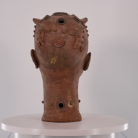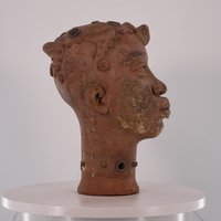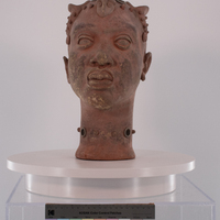Moore’s bust was created during his time as an art student at TSU. Under the instruction of Professor Carroll Harris Simms, artists would create self-portraits embellished with decorations like spirals and accentuated crown pieces, like in Moore’s sculpture. Moore’s crown details include horns on both sides, green holes in the head, and a miniature mask in the center of the forehead. These busts are inspired by Nok terracotta sculptures and Ife busts, which Simms saw during his travels to Western Africa.