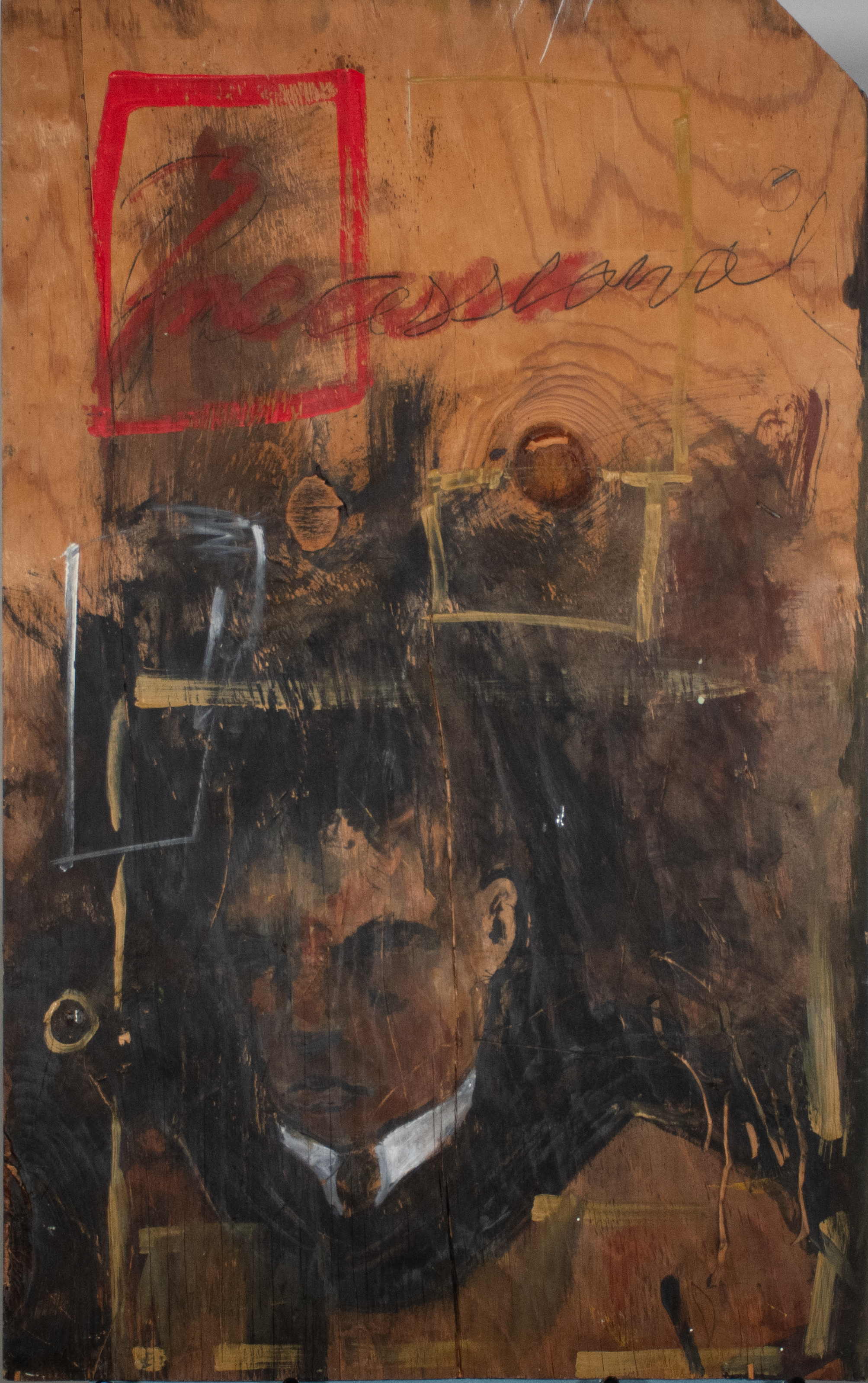 Pruitt’s painting is based on a photo he took of the preacher of his childhood church. At the time this piece was painted, the artist was exploring different faiths and struggling with his religious beliefs. Pruitt cites Basquiat and Rauschenberg as stylistic inspirations that influenced this painting. The muddied brushstrokes used to create this piece reflect the internal struggle of the artist.