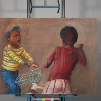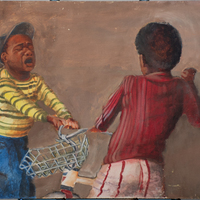 This painting shows children quarreling over a bicycle. The young boy in yellow is painted dramatically wailing, while the other child is portrayed from behind with a raised, balled fist. Dr. John Biggers encouraged Texas Southern student artists to create art based on what they saw. Scenes of children often appear in the permanent collection of TSU.