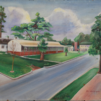 Washington’s landscape painting shows a suburban setting, with a paved road, low homes, and a mix of palm and deciduous trees. Washington grew up in Port Arthur, Texas, a small oil city along the Gulf Coast. This scene is perhaps reminiscent of Washington’s home and early life. Dr. John Biggers encouraged Texas Southern student artists to create art based on what they saw – perhaps this instruction inspired Washington’s painting.