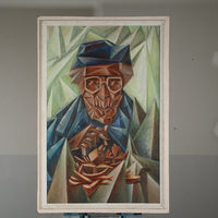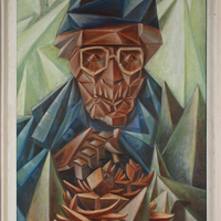 Donato’s painting portrays an elderly woman feeding hungry birds. This particular geometric style of painting is characteristic of students of Dr. Biggers who attended Texas Southern in the mid-to-late 1970s. The mother-child relationship is a common motif in the artwork of TSU students, usually a human mother and child or an animal mother and child. This painting seems to be unique in its depiction of a cross-species maternal relationship.