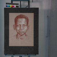 Onyeiwu’s drawing is of a young boy wearing a smirk on his face. Onyeiwu creates incredible, realistic portraits with fine details. Originally from Nigeria, Onyeiwu received his undergraduate arts degree from Texas Southern, and has since returned to teach drawing and painting classes at TSU.