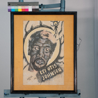 Carter’s drawing is of Lee Otis Johnson, a former TSU student, organizer, and leader of the Houston Student Non-Violent Coordinating Committee. Houston police repeatedly targeted Johnson, and in 1968 they arrested him for passing marijuana to an undercover officer, and a judge sentenced him to 30 years in prison. This injustice gained widespread notoriety, and “Free Lee Otis” became a rallying cry.