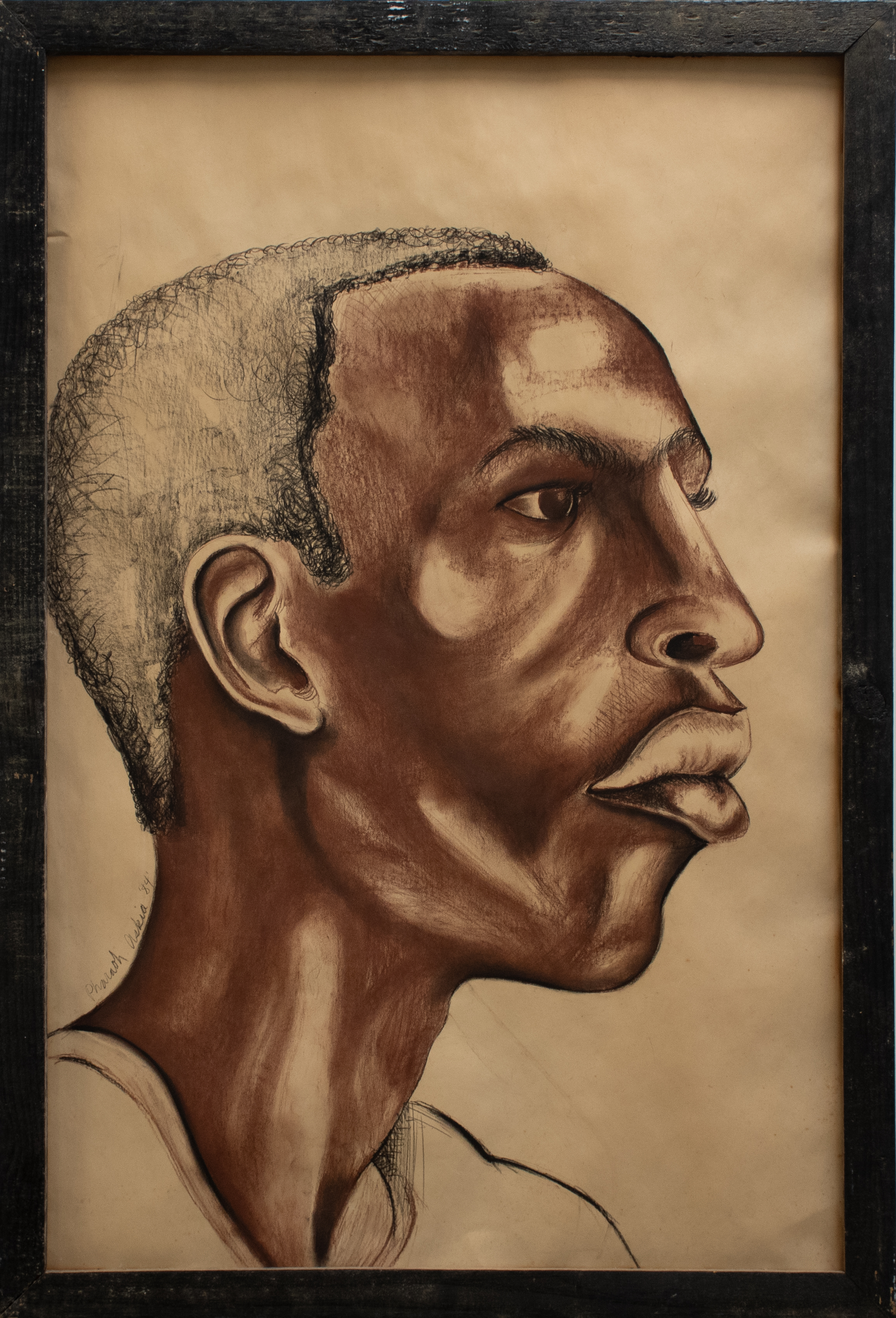 Askia’s drawing is a side portrait of a man looking into the distance. There is no background and only a sliver of his shirt is visible, implying the man is not confined to a specific time or setting. Many of Askia’s pieces are similar - drawn with pastel on paper, and placing the subjects outside of time and space.