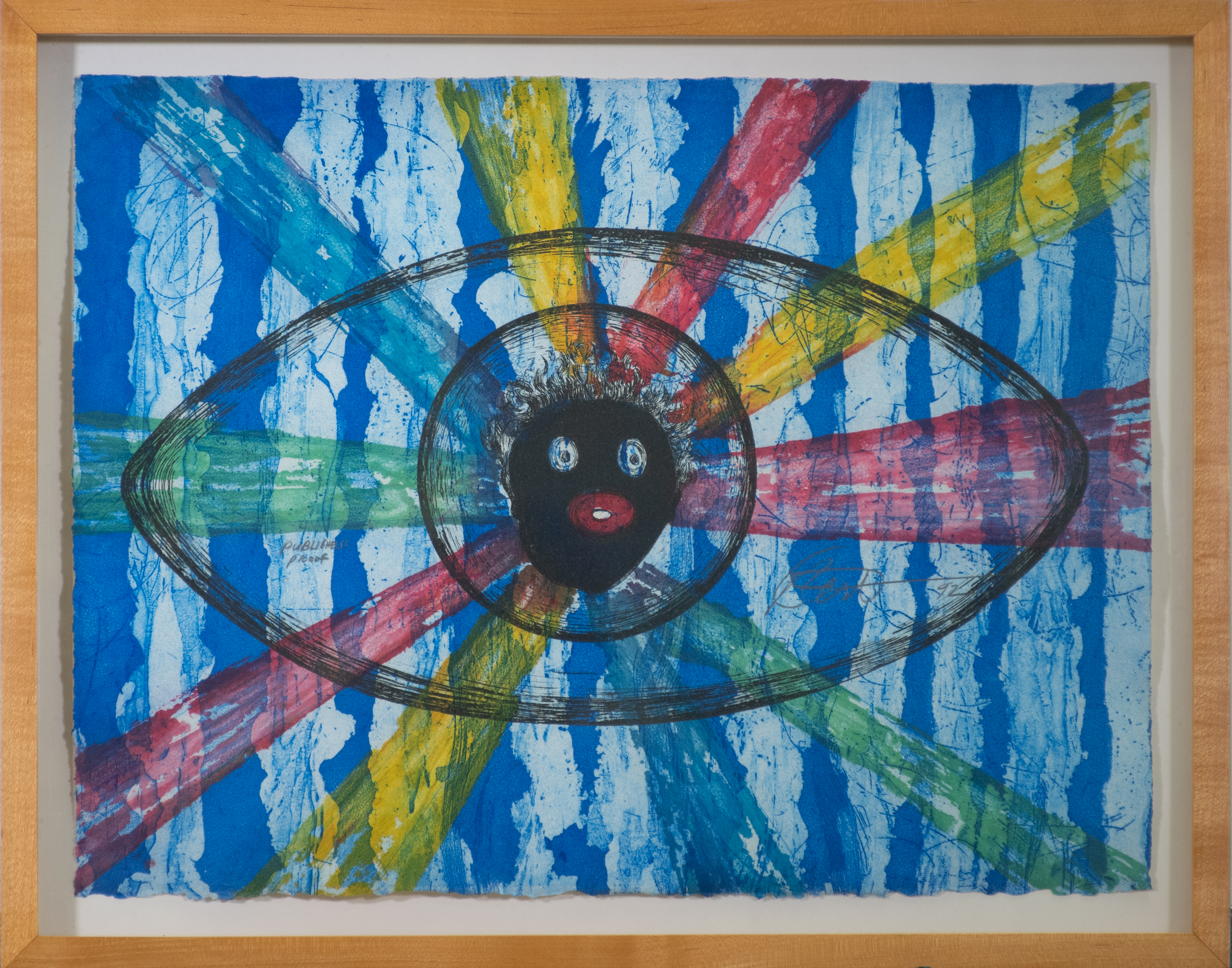 This is a publisher’s proof for Long’s print Post Rome, which was created during his 1990 Prix de Rome fellowship. At the center of the design is a large, oval-shaped eye. This is a frequently used motif in Long’s artwork, across many different mediums. The vertical and diagonal rays and bars draw attention towards the eye, which features a man’s face where the pupil would be.