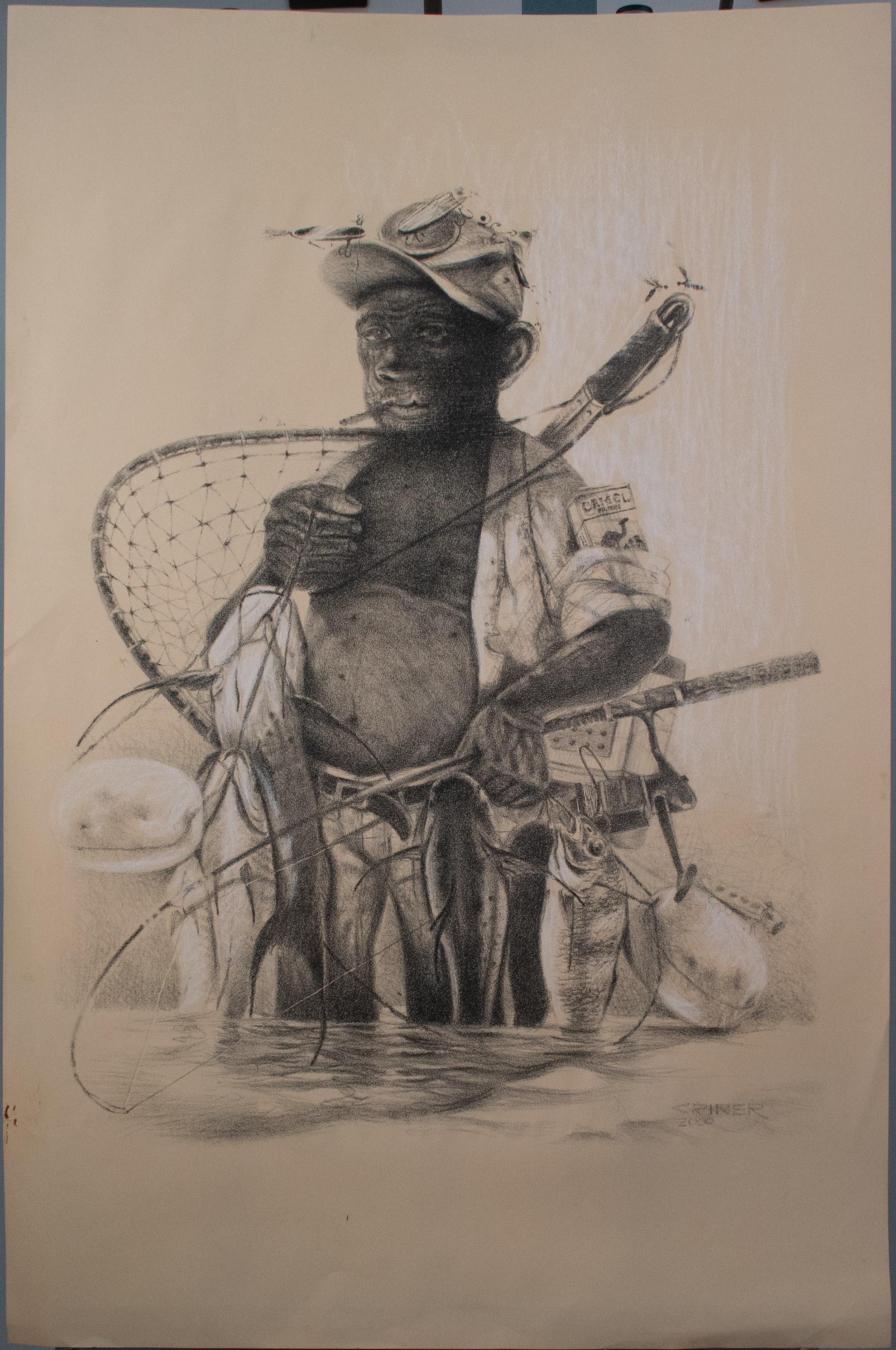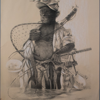 Criner’s print shows a man fishing; he is holding several catfish that he has caught. He is wading in the water with his hands full of fishing gear. Criner learned printmaking firsthand from Dr. John Biggers and was the longtime artist-in-residence at Houston’s Museum of Printing History.