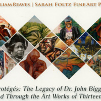 This is an invitation from William Reaves - Sarah Foltz Fine Art gallery to the exhibition Protégés: The Legacy of John Biggers As Viewed Through the Artworks of Thirteen Students. The featured artists - Charles Criner, Geraldine Crossland, Karl E. Hall, Earlie Hudnall, Jr., Harvey Johnson, Earl S. Jones, Josie Mendoza Postel, Robert Meyers, Elizabeth Montgomery Shelton, Kermit Oliver, Jesse Sifuentes, Charles Thomas, and Roy Vinson Thomas - are all Texas Southern alumni and students of Dr. Biggers.