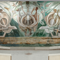 Texas Southern University students commissioned Biggers to paint this mural in the cafeteria of the student center. Composed of several distinct but interrelated images, Family Unity features several Afrocentric motifs that Biggers developed, including sacred geometry (checkerboards and spirals), shotgun houses, and husband-and-wife pairs. At the center is what Biggers called the “morning star,” which shows a couple embracing with their form suggesting a womb.