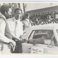 This photograph was taken at Florida A&M University’s annual Homecoming Parade on October 18, 1975. As the procession strolled through Frenchtown, a historic Black, middle-class Tallahassee neighborhood, someone shot University President B. L. Perry shaking hands with Mr. Roberts of Economy Drugstore, a Black-owned pharmacy vital to the community.