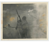 This riveting black-and-white photograph is an action shot of three running soldiers seemingly engaged in battle, holding weapons and engulfed in smoke. It is unclear who took this picture or when, but it was found in the Thelma Gorham collection, the former Florida A&M Dean of Journalism and Graphic Communication and wife of a Black soldier.
