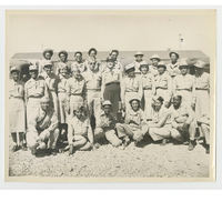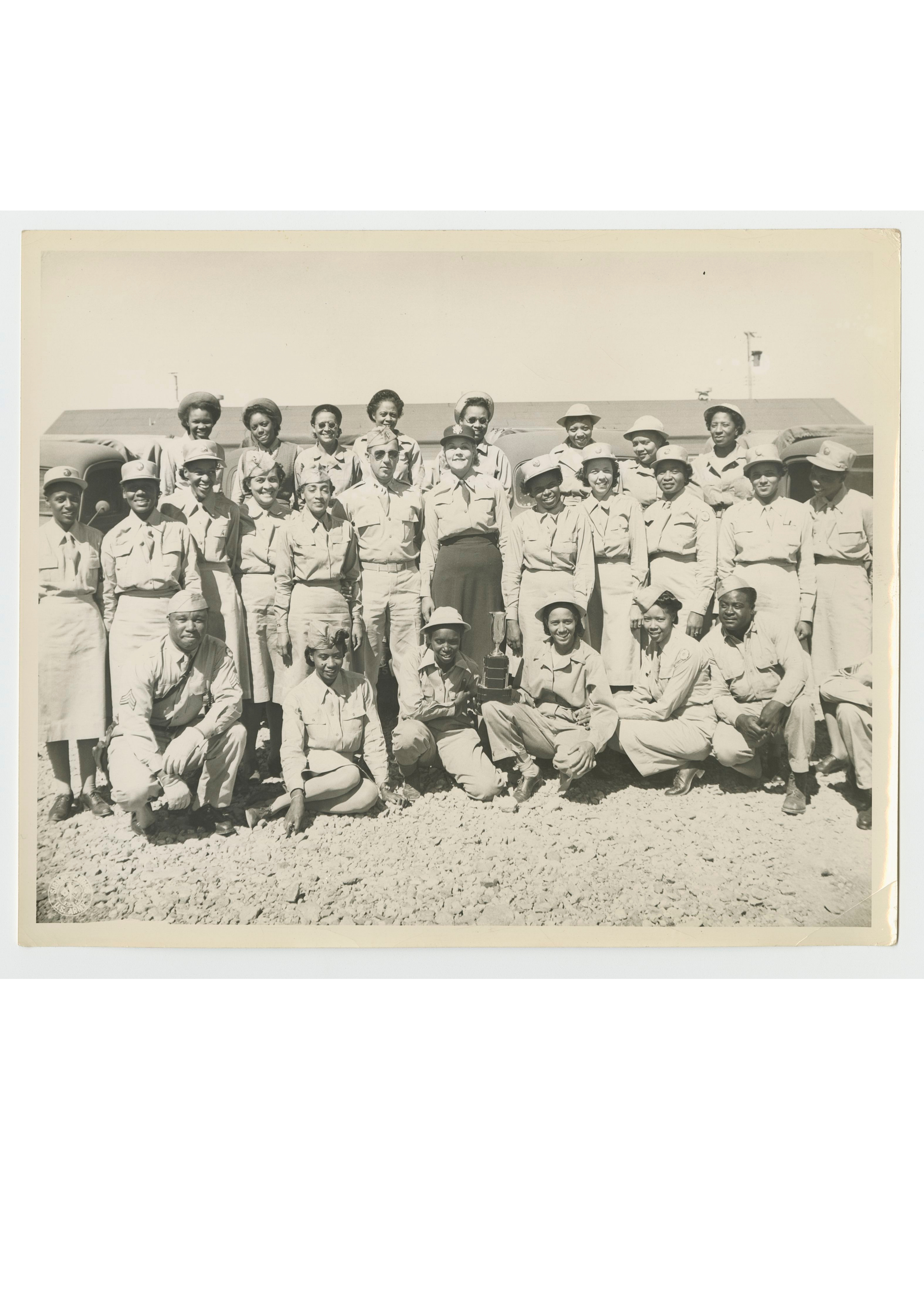 This photograph belongs to the Signal Corps, U.S. Army. Within this picture, two Black female soldiers squat and kneel with a trophy while others smile and pose for the camera. This interracial, intergender photograph shows the inclusivity of the U.S. military.