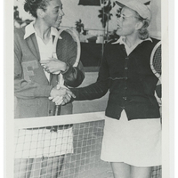 In this rare photograph, Althea Gibson is wearing a Florida A&M cardigan and shaking Alice Marble’s hand as they stand over the net conversing. Marble was a heavily decorated tennis player, and her American Tennis Magazine editorial on segregation in tennis paved the way for Gibson’s entry in the 1950 U.S. National Championship (which she won).