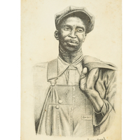 A 1973 pencil sketch of an African American Blue Bell man by Thomas Harris. The hat-wearing man is looking off to the side with his jacket draping his shoulder, showing off his “Blue Bell”-tagged apron (or overalls) and collared shirt.