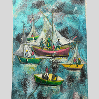 This untitled painting from the FAMU Black Archives/Caribbean Art Collection has limited identifiers for proper attribution but is associated with Dr. James Eaton and Frank Pinder Collections. The piece is of a boating community sailing in the ocean and features an illegible inscription on the lower left corner that could be the artist’s signature.