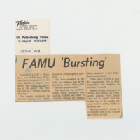A 1969 newspaper clipping from the St. Petersburg Times describes an interaction between Florida A&M President Dr. Benjamin L. Perry and the State Board of Regents. Perry complained that “FAMU is ‘bursting at the seams’ because of a student housing storage,” a problem the institution has recurringly faced in recent years.