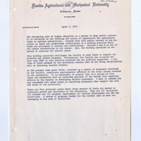 This collection contains a 1972 report from Florida A&M’s Office of Contracts and Grants discussing the increasing cost of higher education due to politicians appropriating funds for university operations. The document presents figures on collateral programs for funding support, aid as a portion of income, and more.