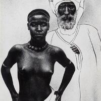Mark Hewitt was an artist from Boston, MA. Slave Girl is a black and white print of a young African woman standing before a bearded man wearing all white. The man’s hand rests on his chest, and the shirtless woman wears a solemn expression and looks towards the viewer.