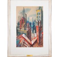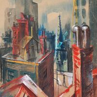John Woodrow Wilson was a sculptor, painter, printmaker, and educator from Roxbury, MA. Roxbury Rooftops depicts an urbanscape from the perspective of the rooftops. The buildings closest to the viewer are shown in hues of red, orange, and yellow. Buildings further away are more brown, green, and gray.