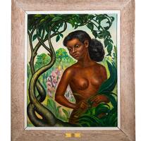 Samuel Albert Countee was a New Negro movement painter and sculptor from Marshall, TX. Brown Girl depicts a nude Black woman in nature. She has a thoughtful expression as she touches the branches that obscure her groin. In the background is a garden scene of pink flowers and lush trees.
