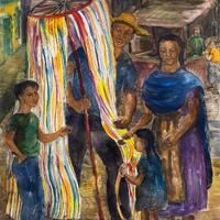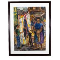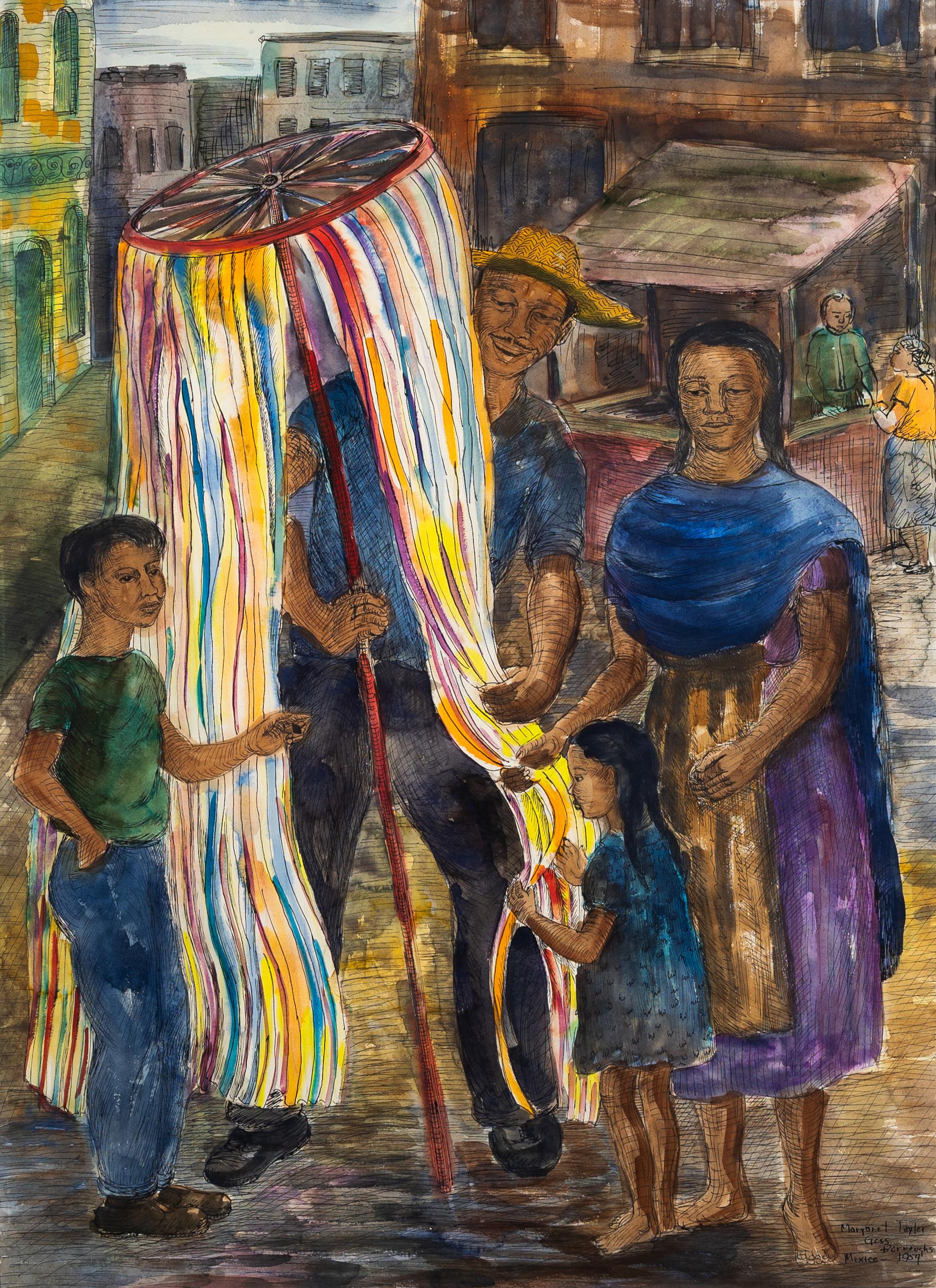 Margaret Taylor Goss Burroughs was an artist, historian, teacher, and writer from St. Rose, LA. Ribbon Man: Mexico City Market is a watercolor scene of a mother buying ribbons for her children. The ribbon seller joyously sells his colorful ribbons in the middle of a market in Mexico City, MX.