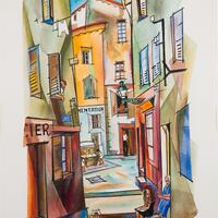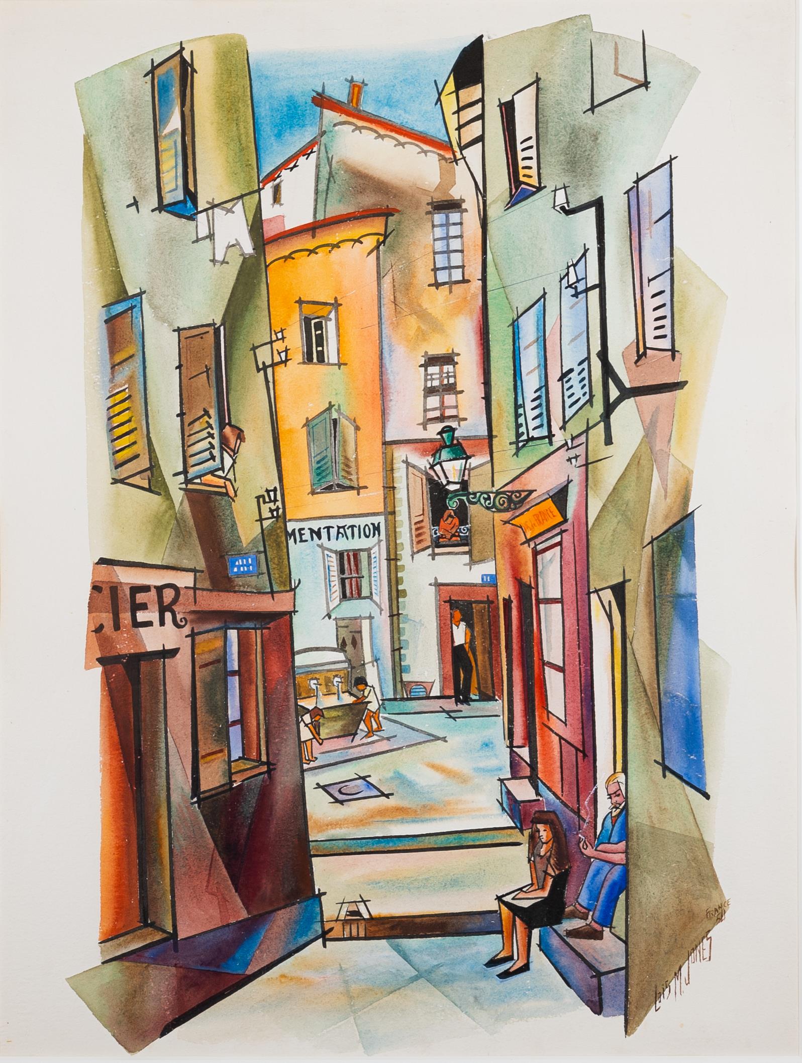 Lois Mailou Jones was an artist and art educator known for her costumes, textile designs, watercolors, paintings, and collages from Washington, D.C. Impasse De L'Oratoire Grasse depicts a dead-end market street in Grasse, France. There are several people in the piece: two smoking cigarettes, two in their windows, two shopping, and one person exiting their home.
