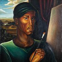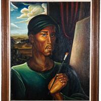 Frederick C. Flemister was an artist from Jackson, GA. Man with Brush is a mannerist self-portrait depicting him in front of an arched window at an empty canvas. Outside of the window is a landscape scene featuring a lake, rolling hillsides, and mountains in the distance.