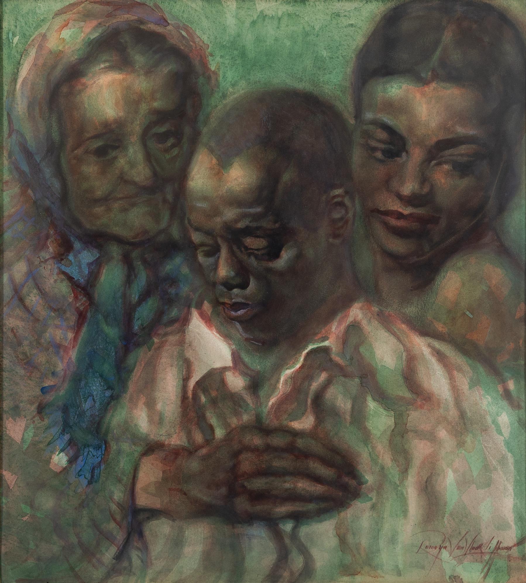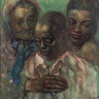 Romeyn van Vleck Lippman was a 19th-century painter and educator. Revival depicts three figures standing in a position of grief and consolation. The central Black boy is looking down grievingly, a Black woman is behind him with an averted gaze, and to his left is a veiled elderly White woman gazing at him while holding his chest.