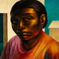 John Woodrow Wilson was a sculptor, painter, printmaker, and educator from Roxbury, MA. Negro Woman depicts a Black woman looking toward the distance from the side of her eyes. She is standing outside in a peach-colored shirt with the sun reflecting off of her face. Behind her are large buildings and a dark blue sky.