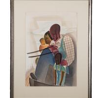 Born in Ohio, Vernon Winslow studied at the Art Institute of Chicago. Sharecropper’s Migration is a watercolor painting of a family with gestural features. With a muted red skin tone, the father rests his hand on his son’s shoulder to reassure him. The family wears a sad but hopeful expression as they ride on a horse carriage.